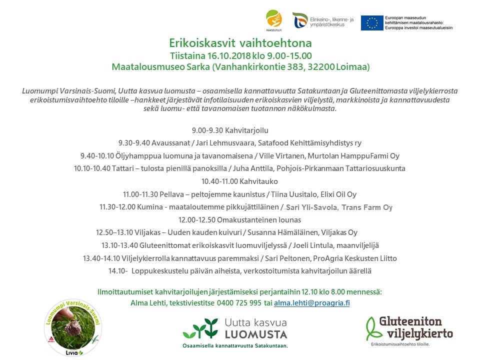 Luomumpi Varsinais-Suomi, Uutta kasvua luomusta – osaamisella kannattavuutta Satakuntaan ja Gluteenittomasta viljelykierrosta vaihtoehto tiloille -hankkeet järjestivät erikoiskasviaiheisen tilaisuuden Sarka-maatalousmuseolla Loimaalla 16.10.2018. Puheenvuoroissa kuultiin mm. erikoiskasvien viljelytekniikoista, markkinoista ja kannattavuudesta.