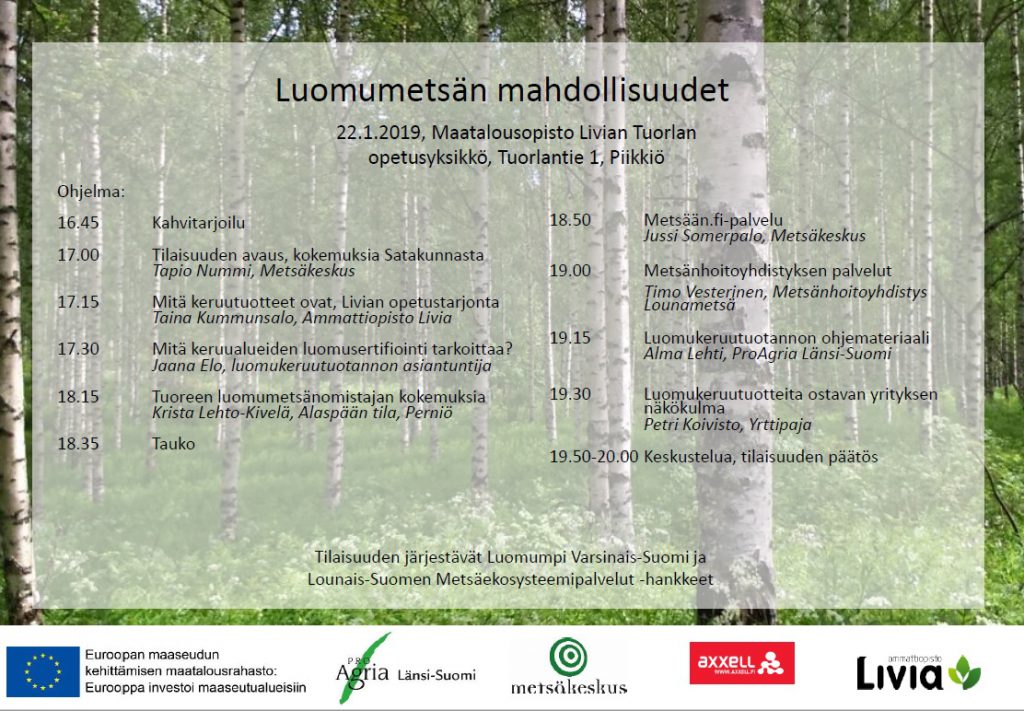 Tammikuussa järjestetty Luomumetsän mahdollisuudet -tilaisuus keräsi Ammattiopisto Livian Tuorlan opetusyksikön auditorioon runsaslukuisen joukon keruualueiden luomusertifioinnista kiinnostuneita. Illan puheenvuorot tarjosivat kuulijoille monipuolisen katsauksen luomukeruutuotantoon ja keskustelu tilaisuuden teemojen ympärillä kävi vilkkaana. Olipa paikalle saapunut myös Turun Sanomien toimittaja ja kuvaaja juttua tekemään. Tilaisuudessa esiteltiin myös Luomumpi Varsinais-Suomi -hankkeessa koottu luomukeruuohje. Ohjemateriaaliin pääset sivuston yläreunan valikosta ja tästä.